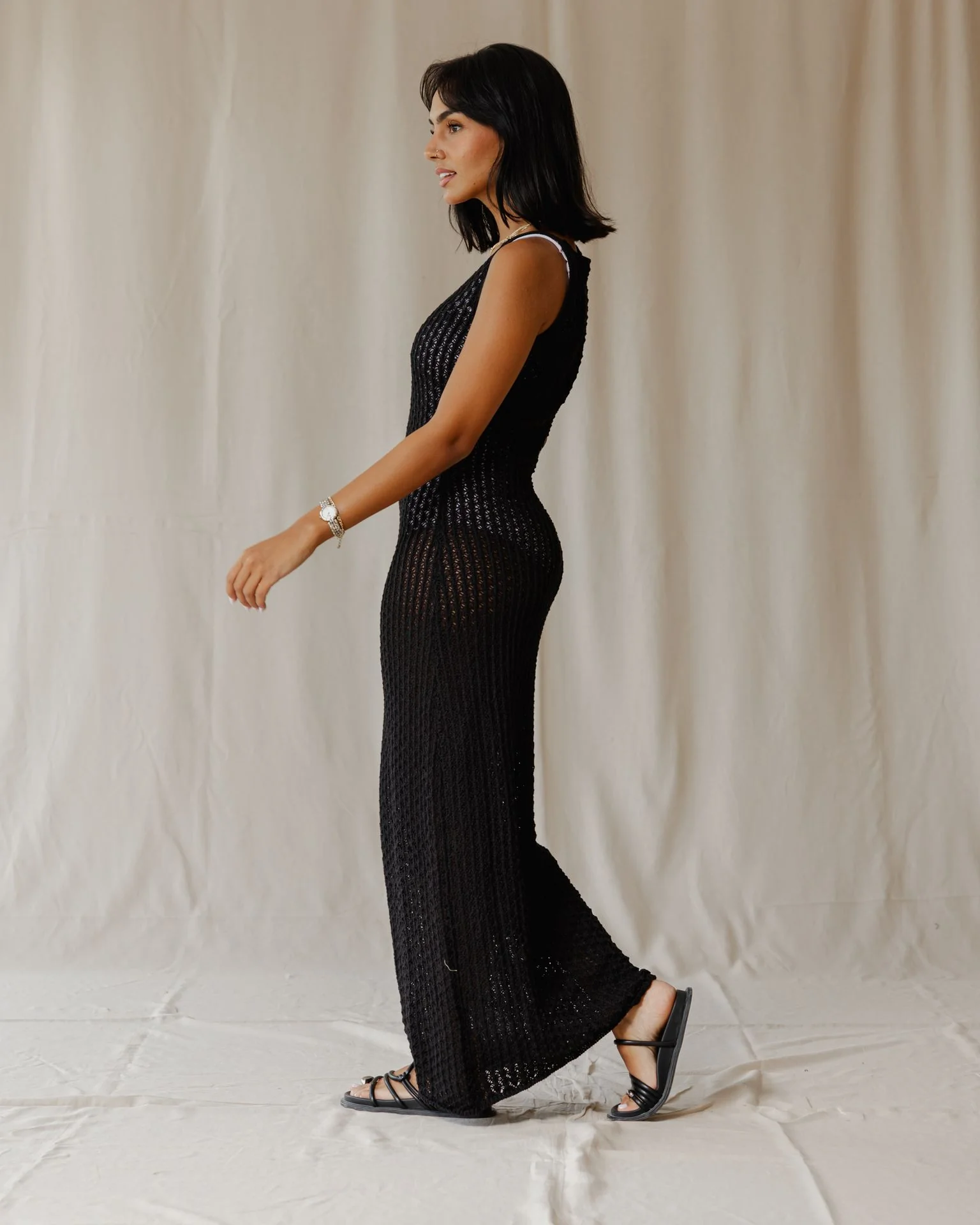 A stunning knit dress, perfect for any occasion. Its versatile design makes it ideal as a stylish cover-up or a sophisticated dress for a night out.