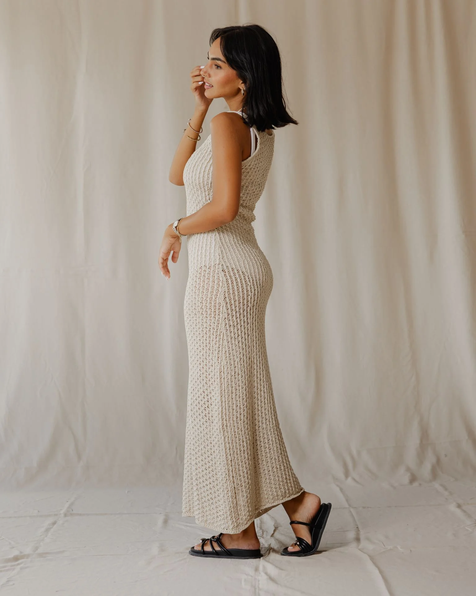 A stunning knit dress, perfect for any occasion. Its versatile design makes it ideal as a stylish cover-up or a sophisticated dress for a night out.