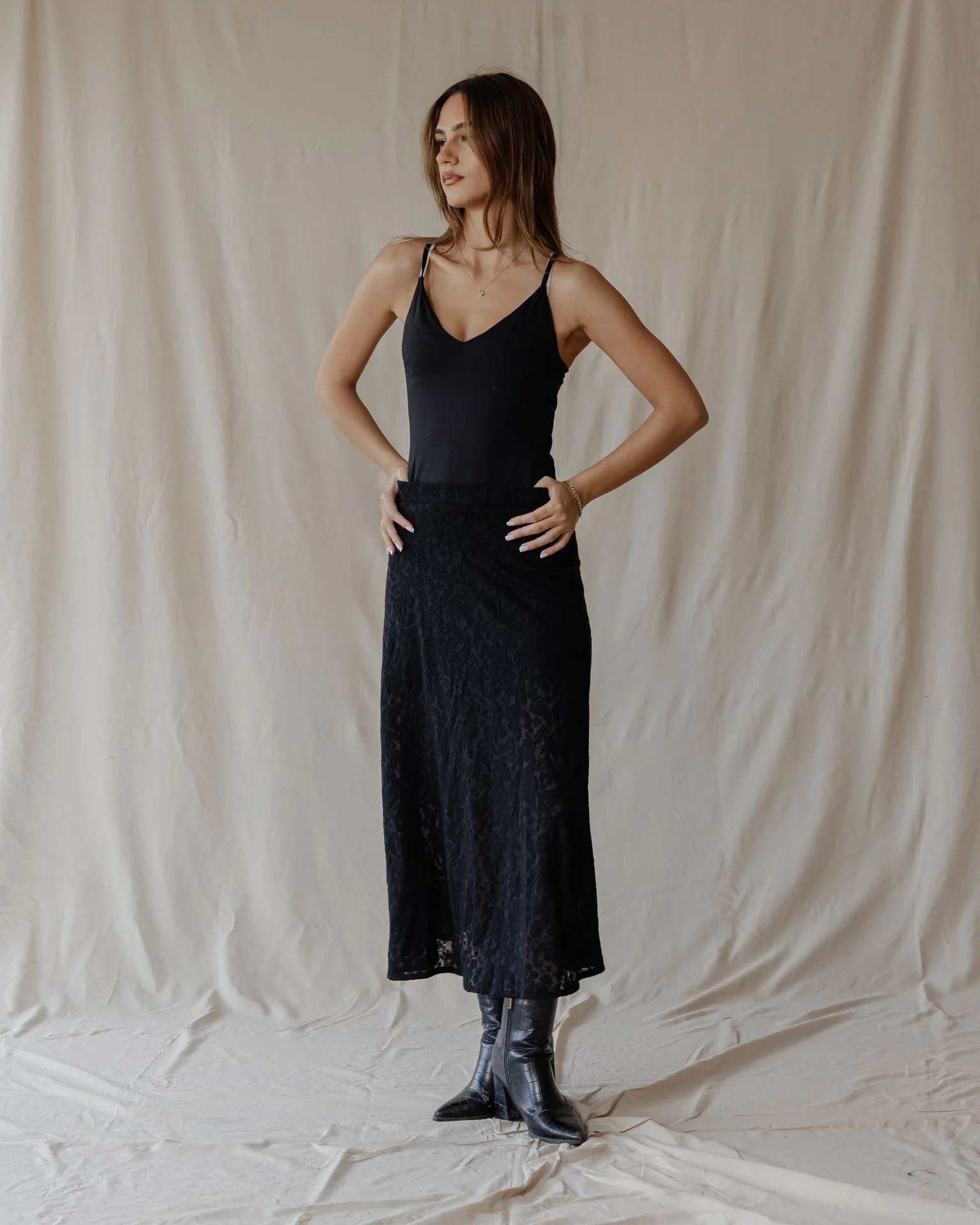 Cut in a soft A-line, this lace midi skirt has all-over texture and an easy drape. Fully lined to mid-thigh for comfortable coverage, it moves beautifully and pairs with the matching top or a simple tee.