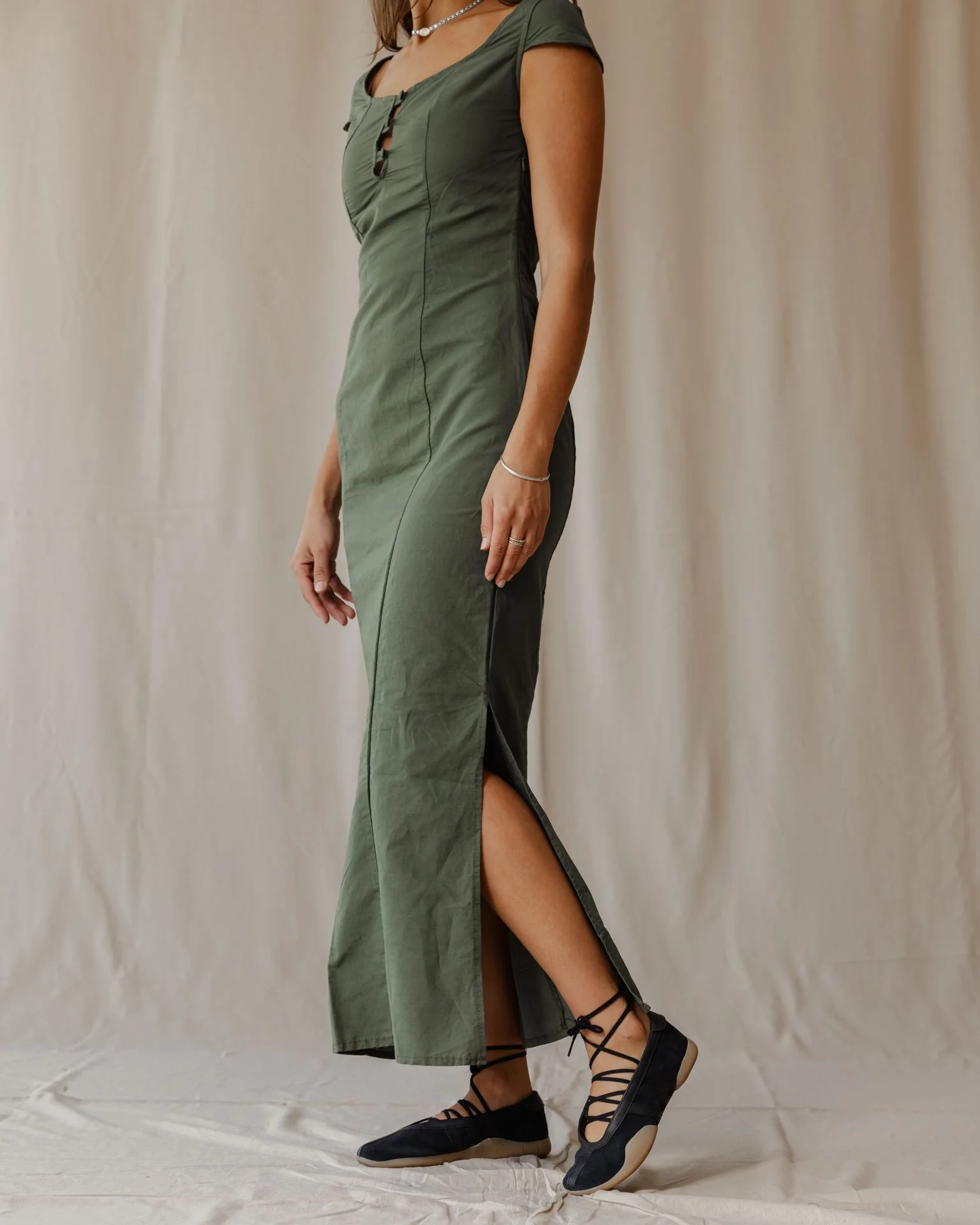 Step out in this stylish midi dress. The simple silhouette is elevated by a sweetheart neckline and subtle front details. It's a versatile piece that feels both current and comfortable, making it a great addition to your everyday wardrobe.